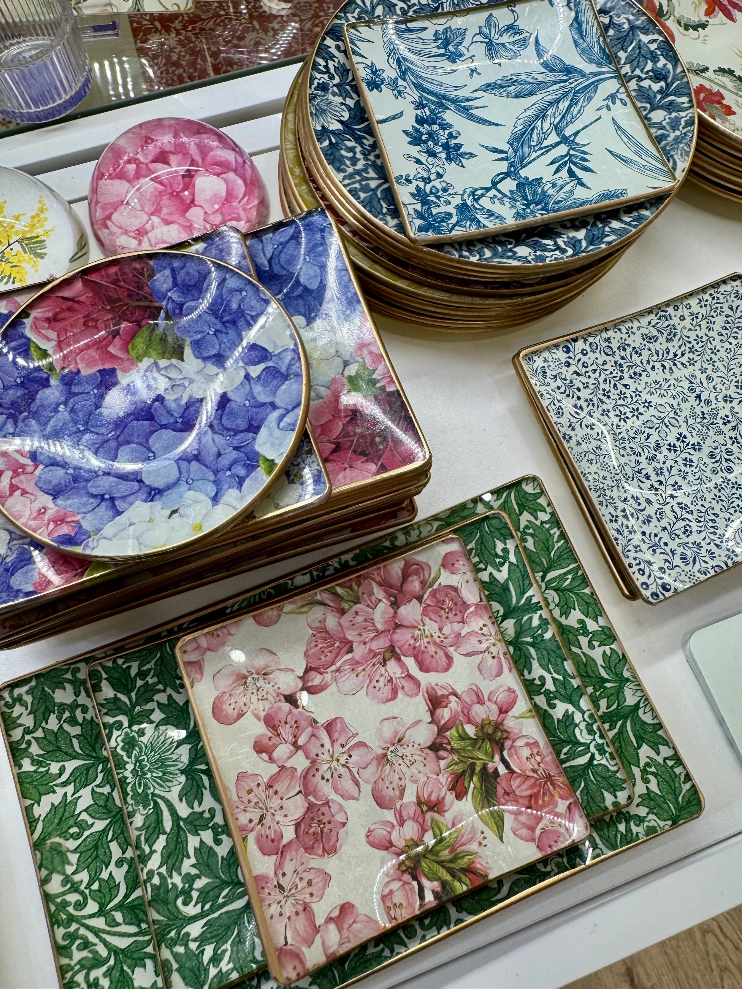 Co-owner Elena Guisasola crafts stunning hand-decorated glass plates and trays designed with elegant color prints and floral designs that look like they’ve been picked fresh from the garden.