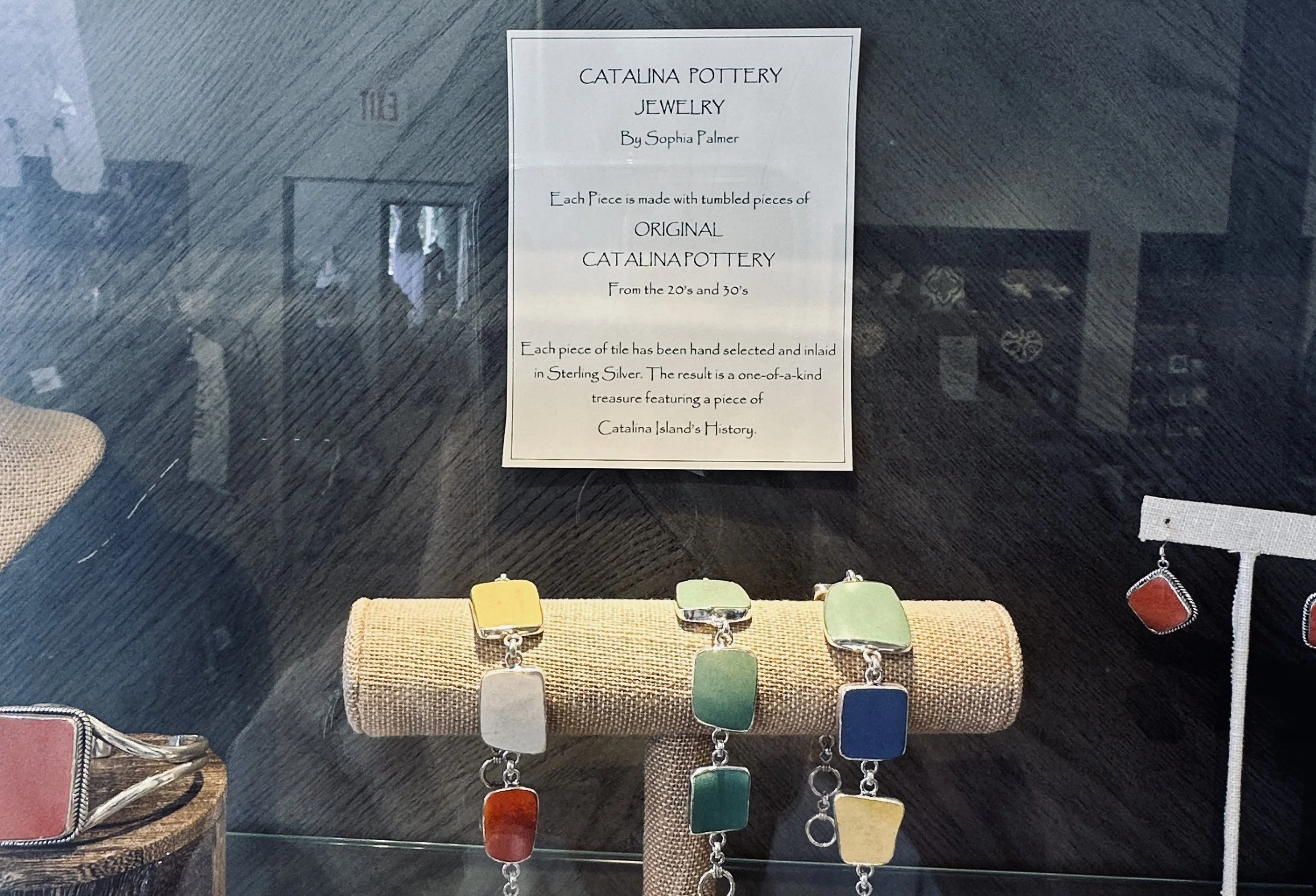 Beautiful jewelry items made with tumbled pieces of original Catalina Pottery from the 20’s and 30’s is available in the store created by artist Sophia Palmer. Each pottery piece is hand selected and inlaid in sterling silver. These colorful, contemporary one-of-a-kind treasures hold a piece of Catalina history forever. Another artist, Kristy Throndson, hand-makes Catalina tile-inspired jewelry for the store as well. Small colorful tile designs are inlaid in burnished metal, giving each piece an antique feel and finish.