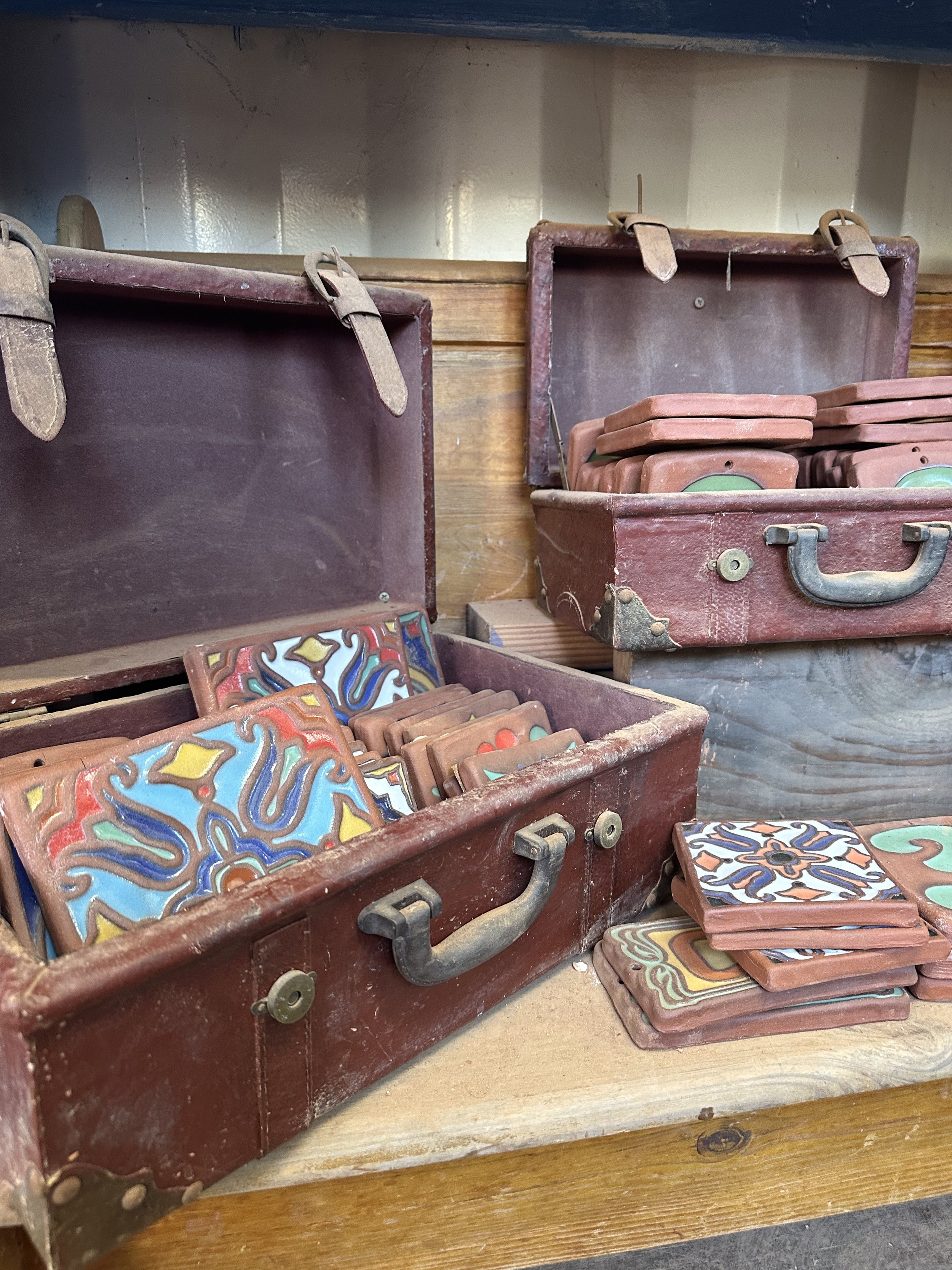 The pottery was sold in free-standing stores in Avalon, Hollywood, Los Angeles and at the Arizona Biltmore Hotel in Phoenix, whose pool was also adorned with the colorful tile. In addition, dinnerware and art ware were sold through luxury department and jewelry stores. The pottery’s tile was used for the interiors and exteriors of buildings on the island and can still be seen around Avalon today. However, in 1937, Catalina Clay Products, including all equipment, stock, molds and trademarks were sold and the pottery operation on the Island was closed. As such, the pottery and tiles have become highly collectible.