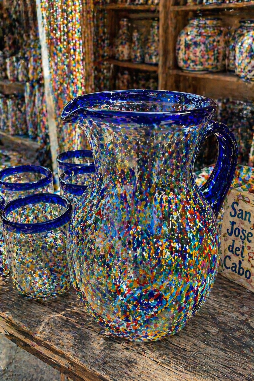 Hand-Blown Glass pitchers and glasses often feature the classic cobalt rim iconic to the region.