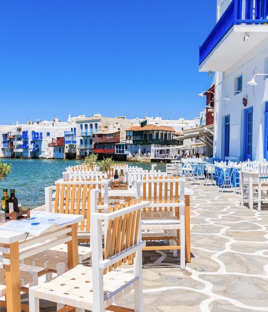 Mykonos Town—known locally as Chora—is a gleaming labyrinth of whitewashed houses, cobalt-blue shutters, and bougainvillea cascading over sunlit balconies. By day, Mykonos feels breezy and bright. Fishing boats sway gently near Little Venice, cafés spill onto stone-paved paths, and the island’s iconic windmills stand watch above the town.