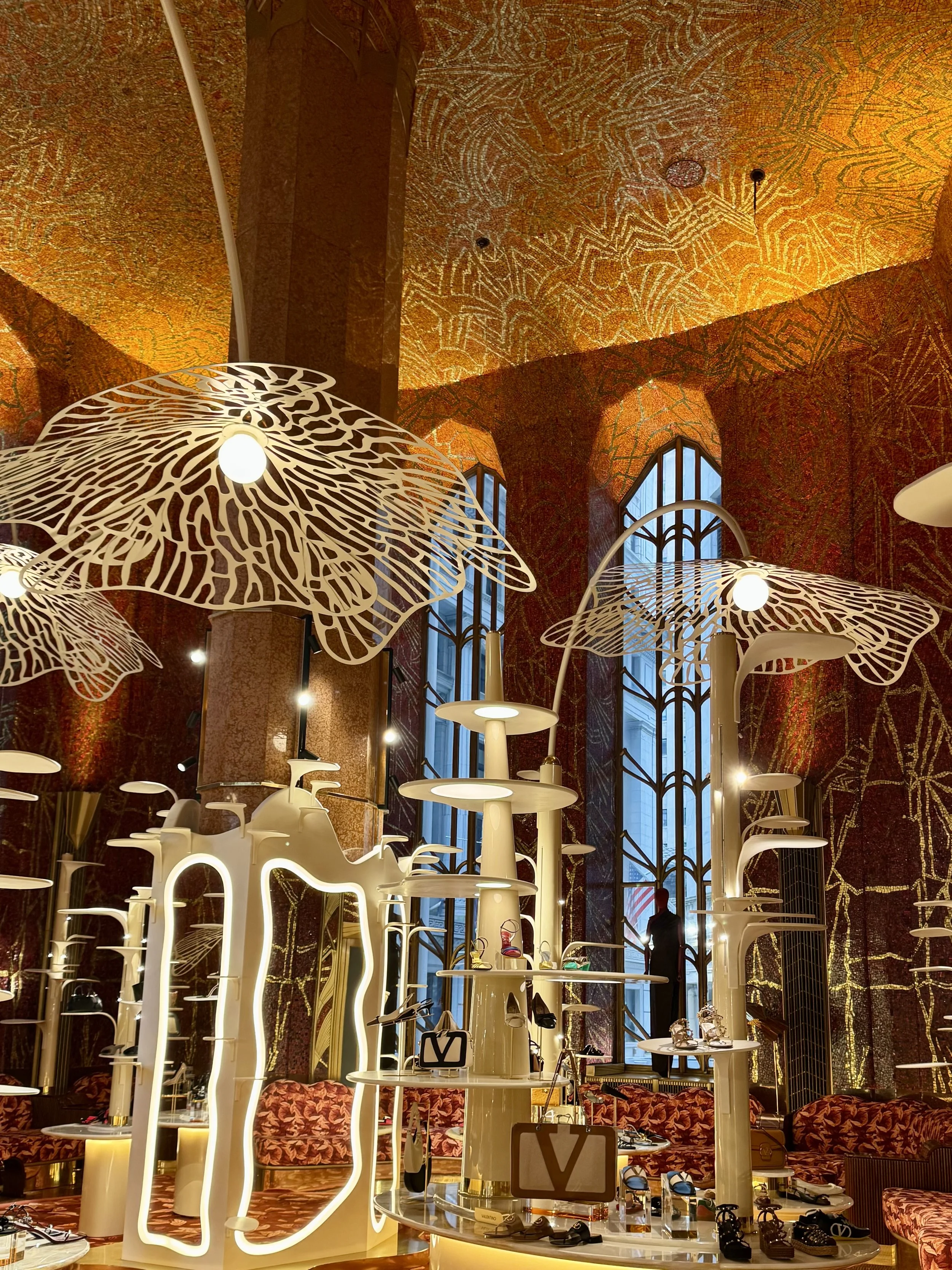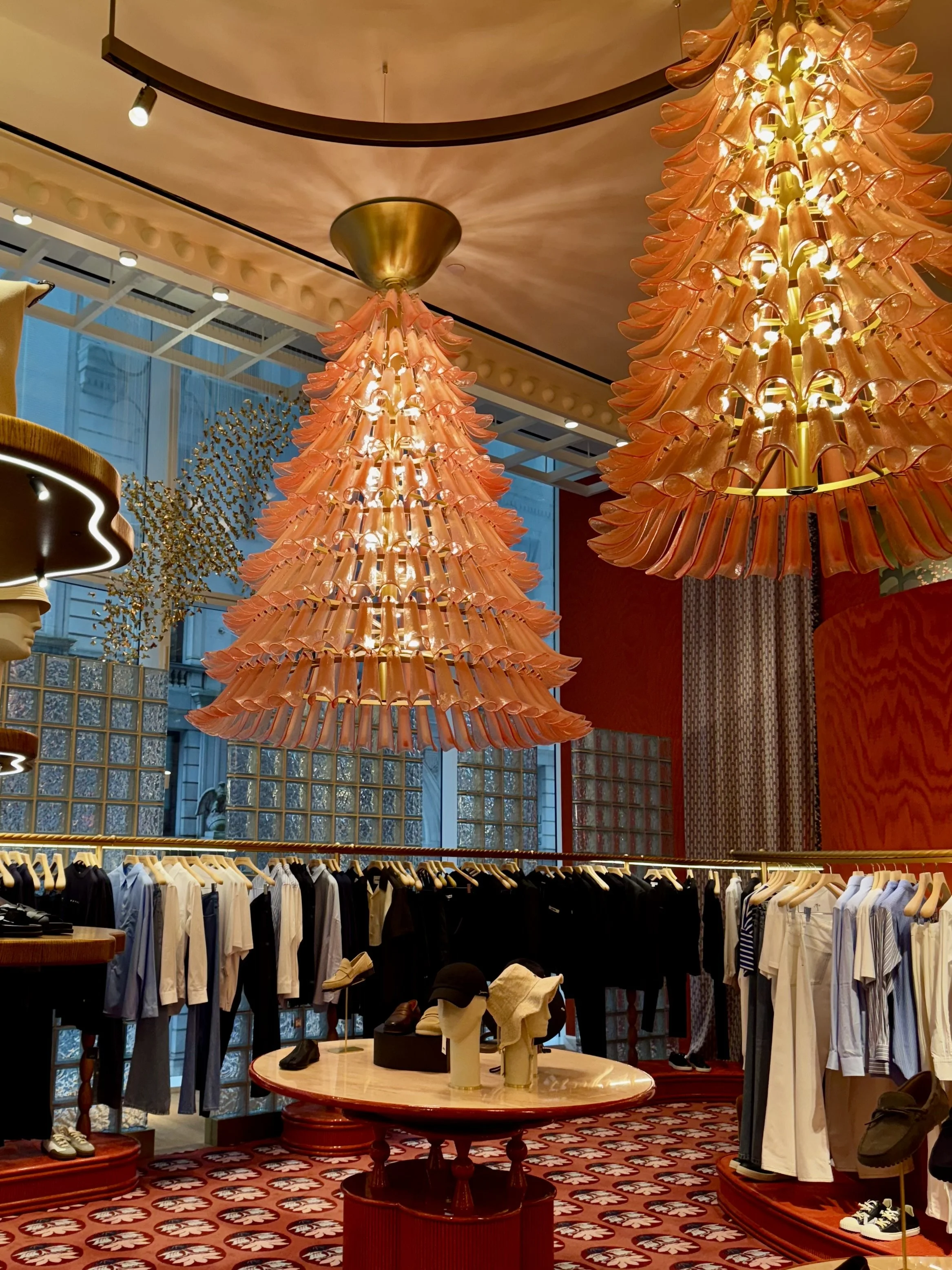 The Aesthetic? A true Joie de vivre. I am awestruck by Printemps’ marble and mosaic floors, warm-colored walls, custom lighting, adorned ceilings, and golden brass accents. The collection of chandeliers draped from ceilings throughout the store is breathtaking. Whether it is a reproduction of a vintage crystal masterpiece or a sculptural glass marvel, Printemps’ lighting is on a runway of its own. Printemps’ architecture artfully blends old-world opulence with contemporary flair.
