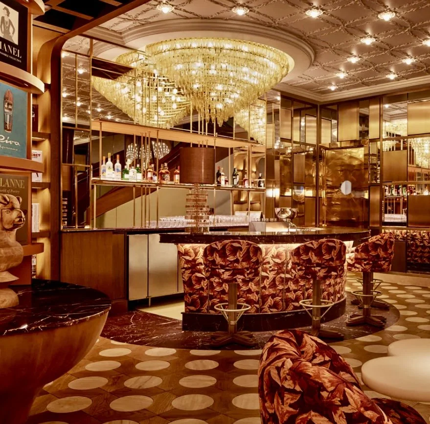 · A mosaic “river” winds its way from the Red Room to the Red Room Bar, designed by Pierre Mesguiche, creating a playful spin on the past and future of Paris and New York.