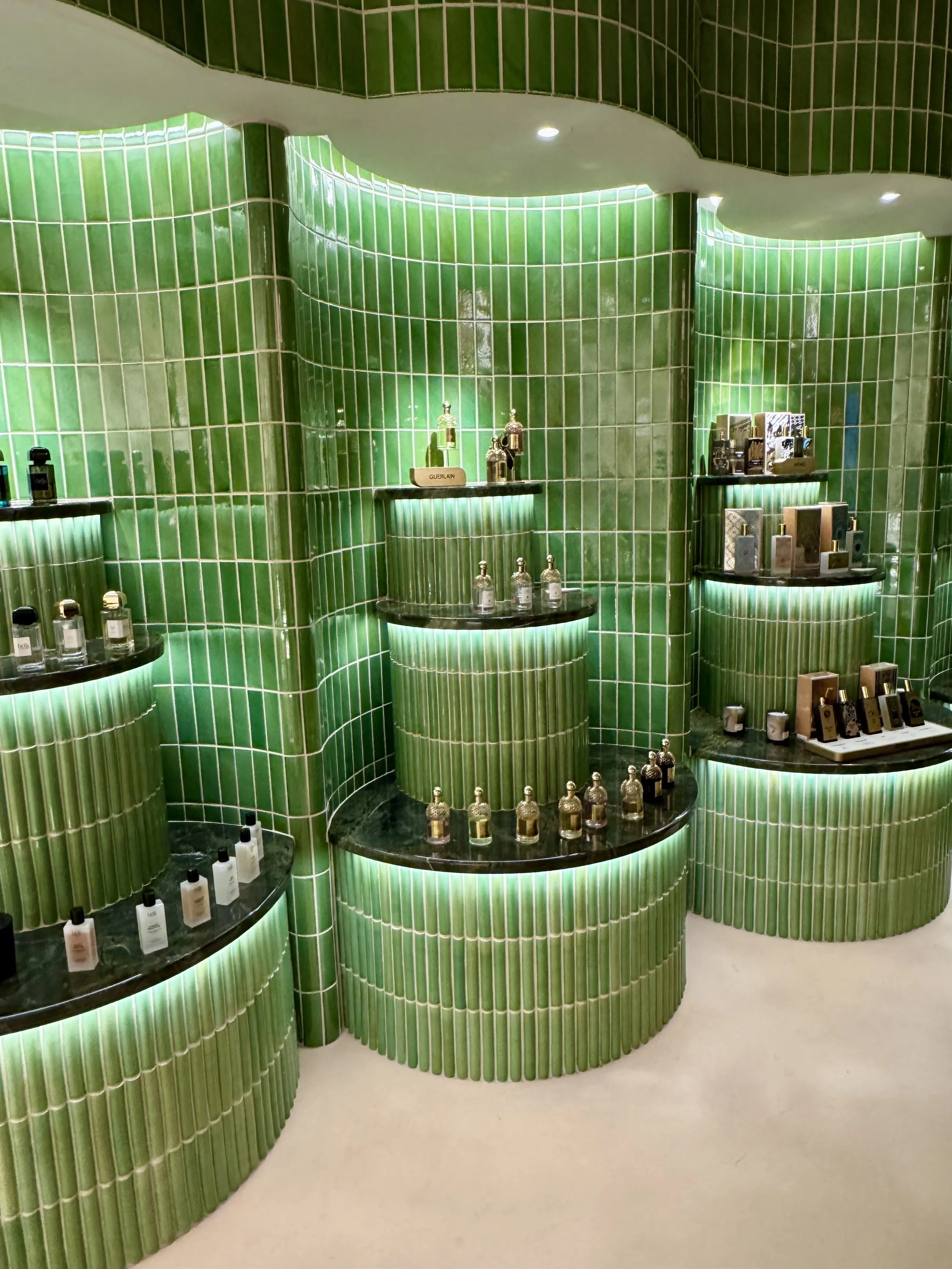Apothecary - Curved niches with Printemps green tiles showcase French fragrances and beauty products. Scents can be blended and customized for each guest as well.