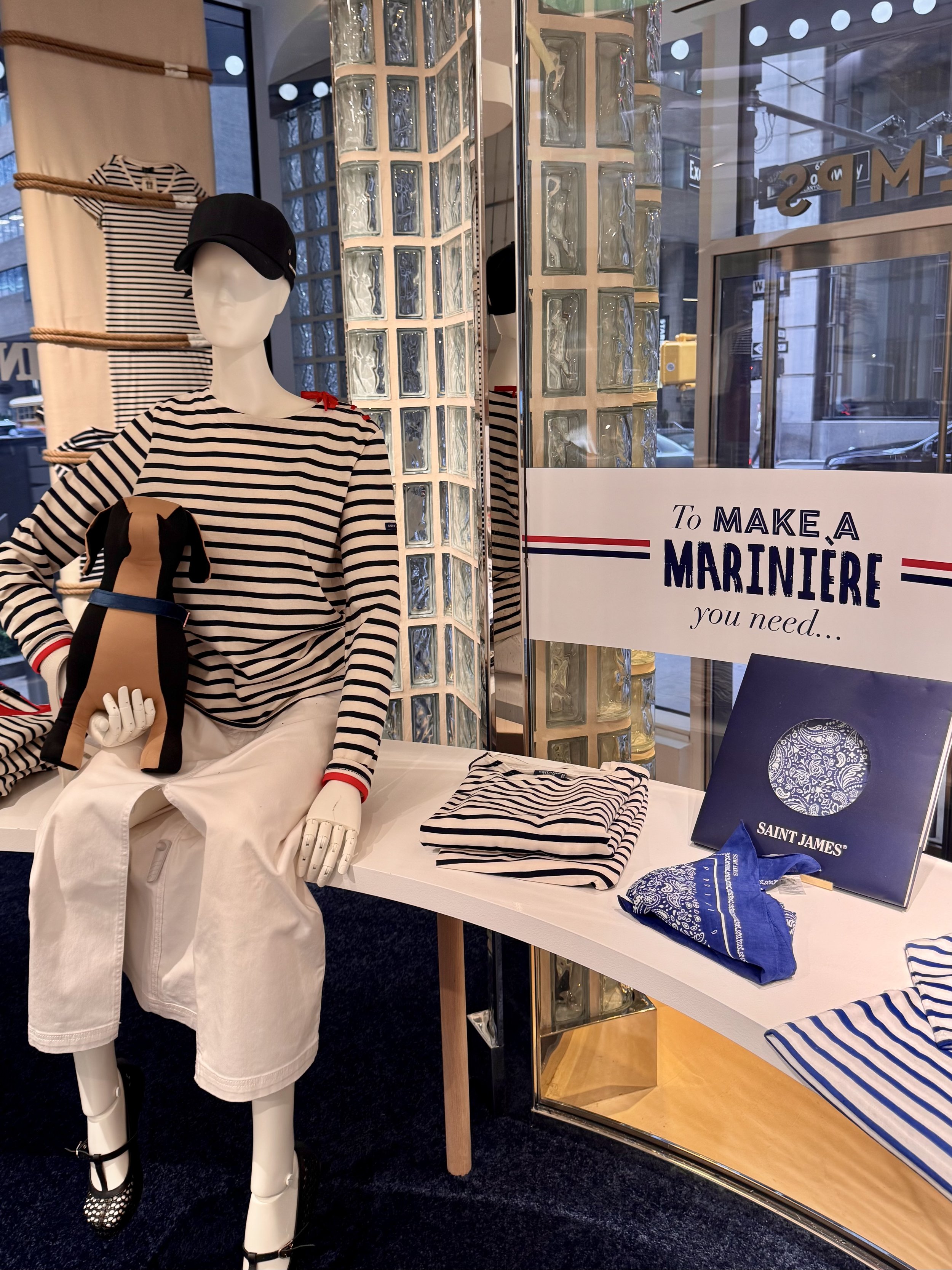 The Playroom– On the main floor, The Playroom welcomes shoppers with a collection of casual apparel, accessories, and specialty gifts from France. A summer pop-up display of mariniere-striped apparel by the 136-year-old French brand, Saint James, brightened a corner looking out to Wall Street.