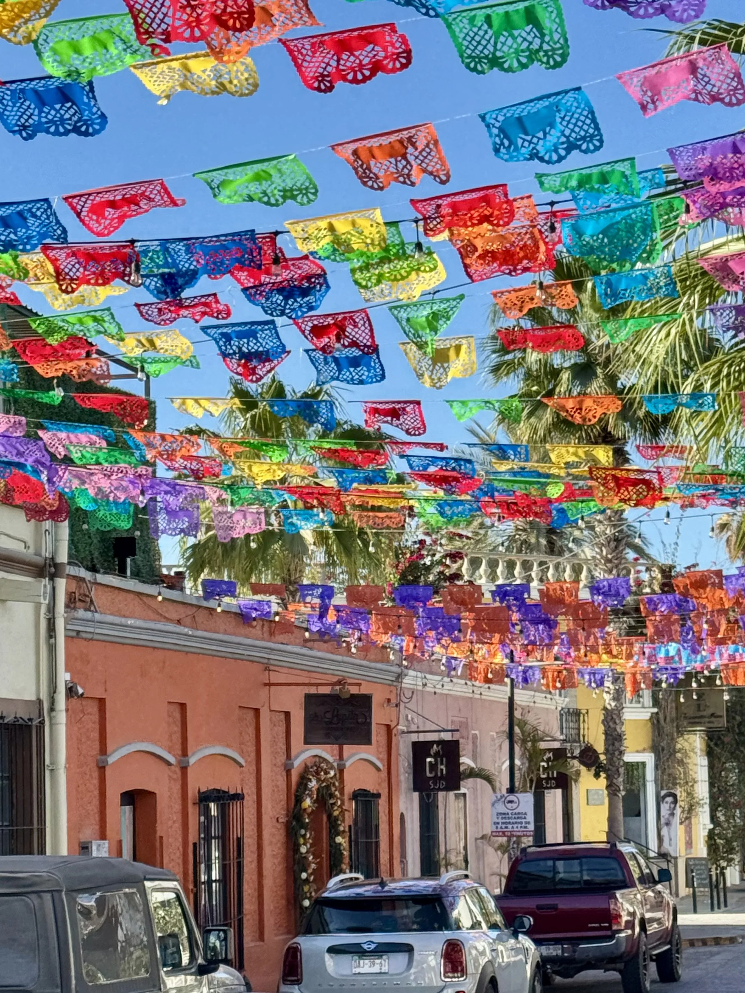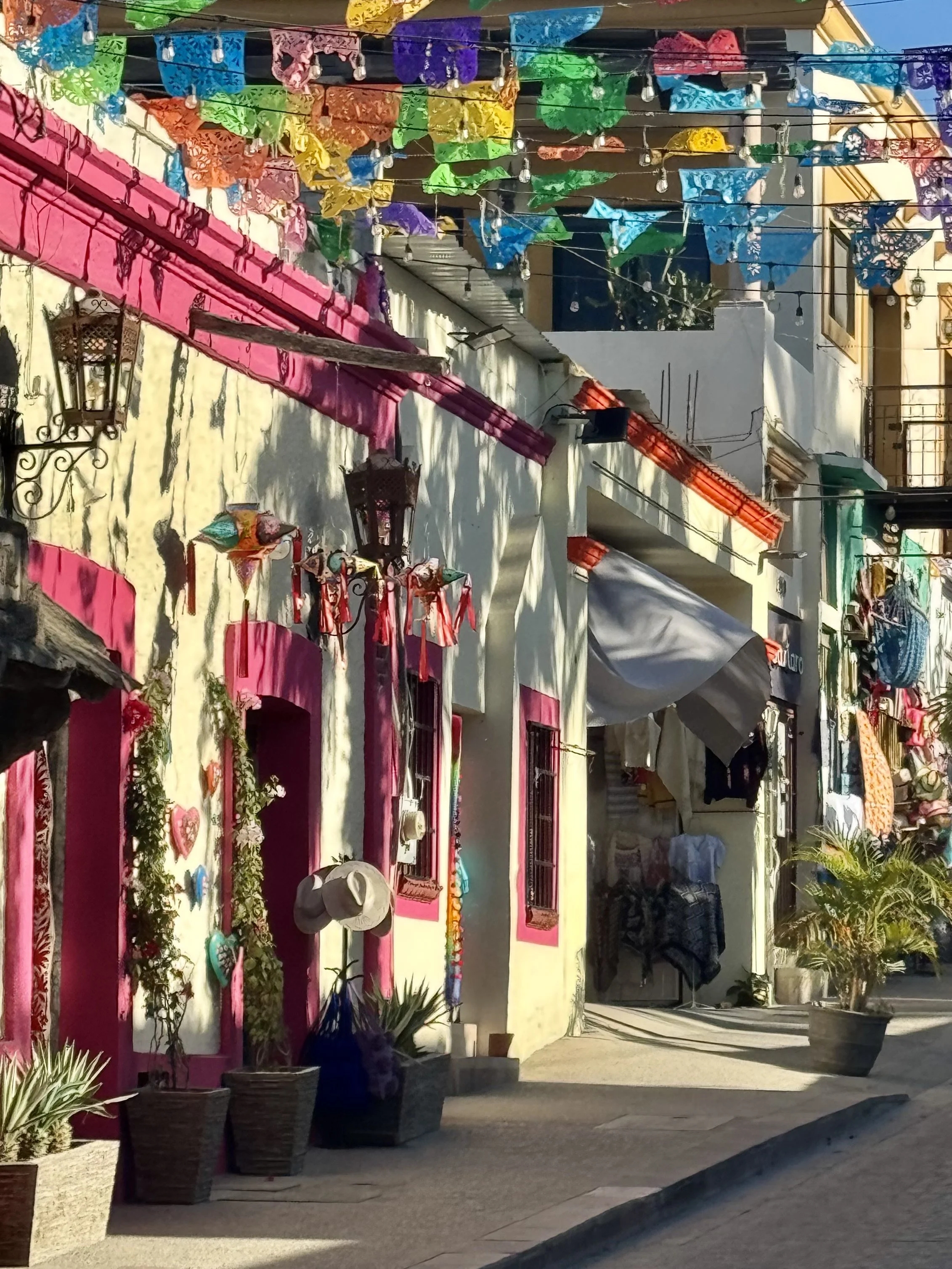 Walking these paths early in the day offers a specific sensory delight because the air remains crisp before the midday sun gets too high. You can hear the faint sound of shopkeepers sweeping doorsteps while colorful flags dance in the breeze, creating a vibrant paper ceiling against the blue Baja sky.